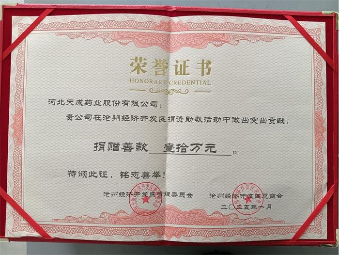 2024年,在沧州经济开发区党工委、管委会的引领以及市委统战部、市工商联的指导下,天成药业协同园区各会员单位携手奋进。凭借各方的共同努力,区总商会荣获沧州市“四好”商会称号,天成药业也成功入围2024河北省民营企业百强系列榜单。