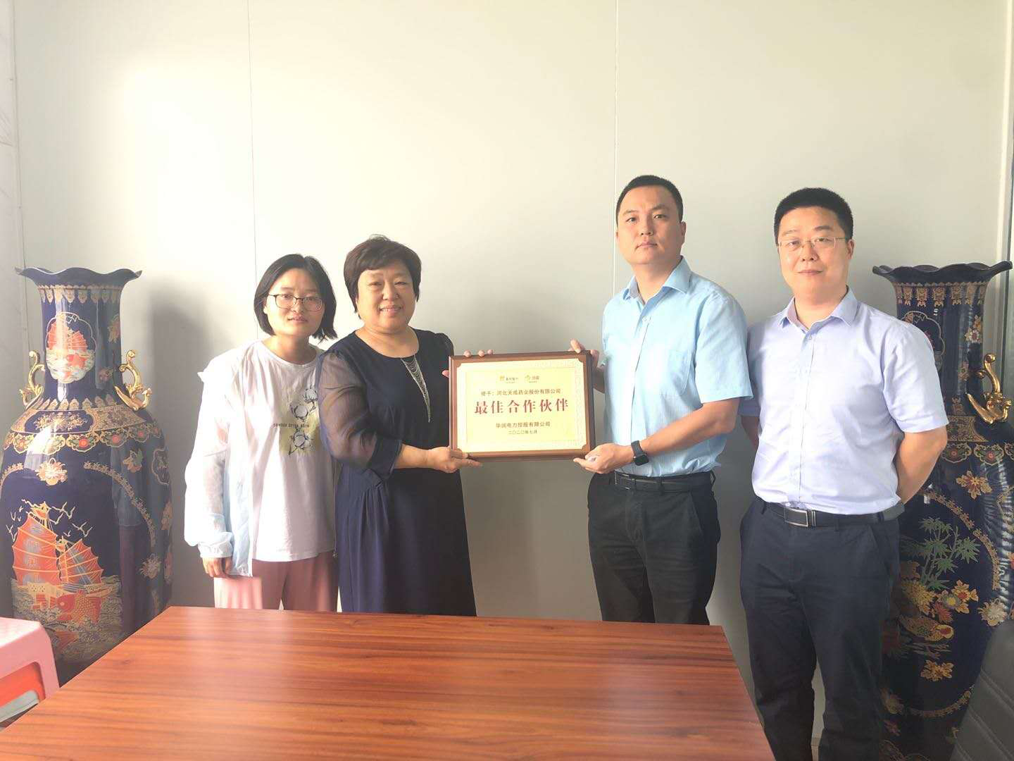 近日,华润电力控股有限公司大客户总监李冰一行为公司送来“最佳合作伙伴”牌匾。公司副总经理宫平热情接待并合影。