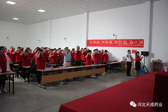 沧州经济技术开发区企业党委负责人曲明利发表讲话,他称赞天成药业党总支部近年来组织建设成果显著,党员精神风貌良好,鼓励我们再接再厉。
